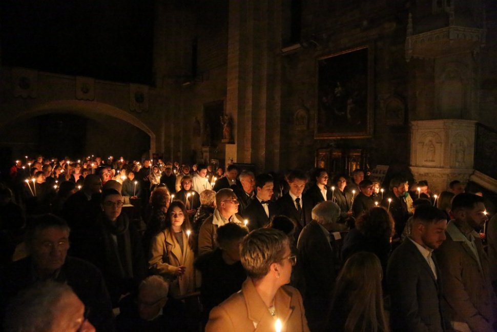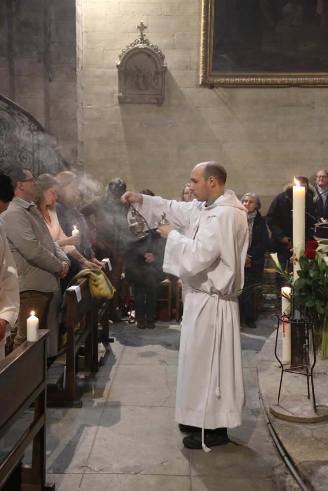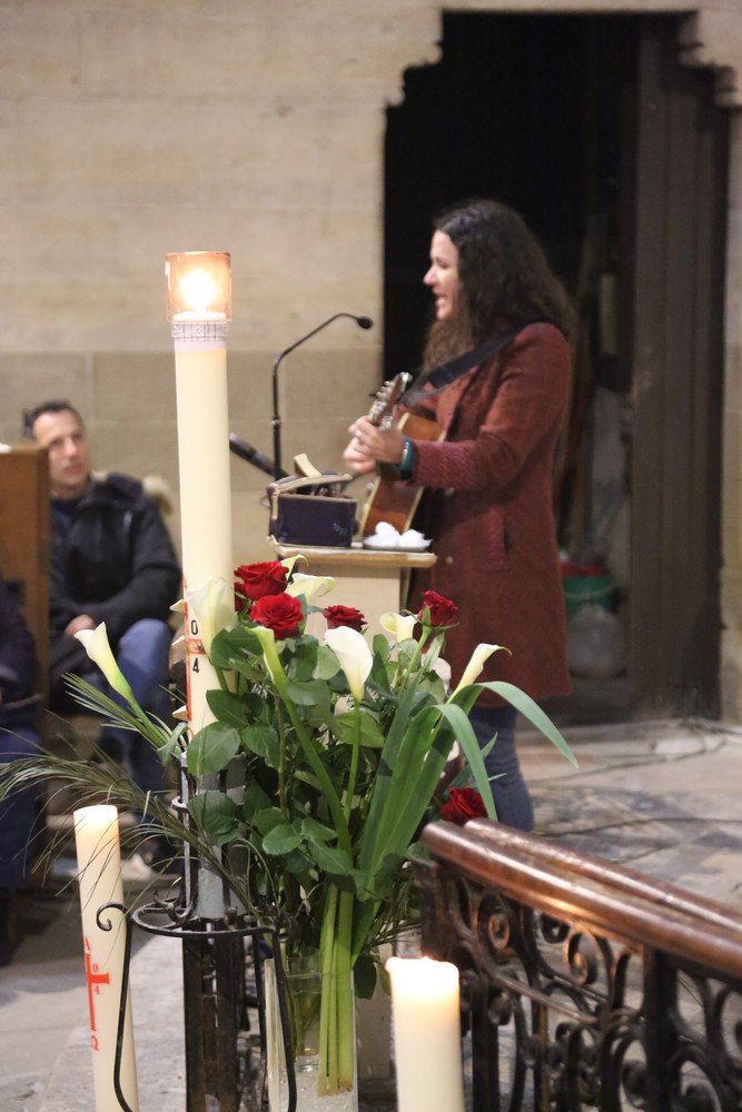 Samedi 30 mars, à 20h30, la vigile pascale a débuté avec le feu nouveau dans la cour de la salle saine Marguerite suivie de la procession avant d’arriver à l’entrée de l’église où chacun a pu recevoir la lumière.